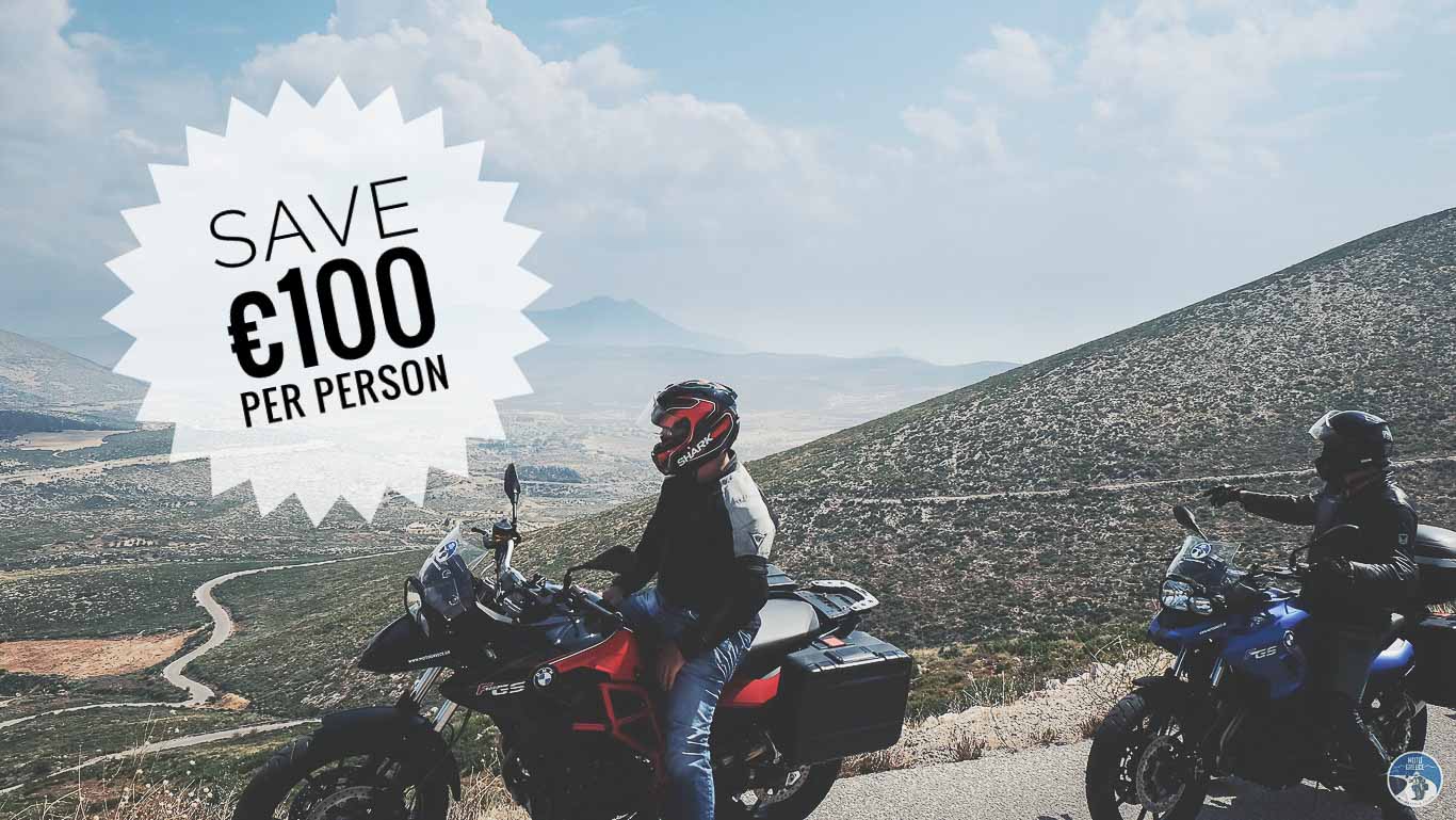 If you are planning to go on a guided motorcycle tour in Greece, now is the time to make your reservation, as you will receive a discount of 100 euros per person, provided that you complete your reservation and pay a deposit earlier than January 10 !