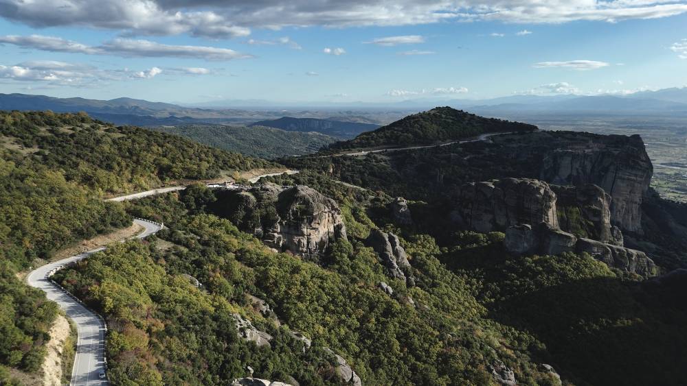 The longest distance day of the tour – expect 5-6 hours of riding time before breaks. The route crosses central Greece via varied terrain: an alpine pass, agricultural plains, and secondary countryside roads before reaching Meteora.