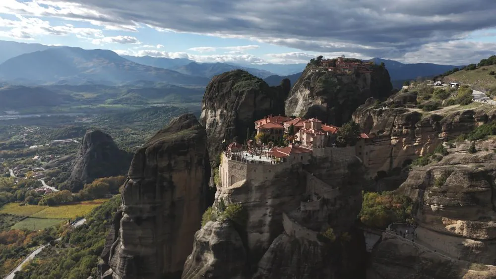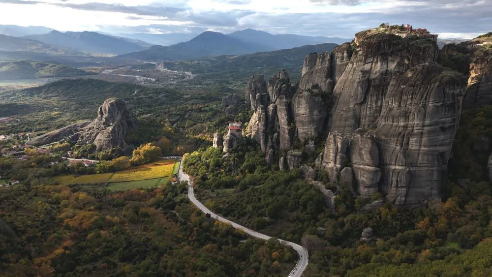Both routes converge approaching Kalambaka, where the Meteora formations become visible from approximately 15km out – vertical stone pillars rising 400 meters above the valley floor.
