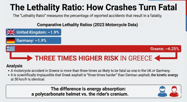 Analysis: A motorcycle accident in Greece is more than three times as likely to be fatal as one in the UK or Germany. It is scientifically implausible that Greek asphalt is “three times harder” than German asphalt. The kinetic energy of a crash at 50 km/h is identical in Athens and Berlin. The difference lies in how that energy is absorbed. In Berlin, it is absorbed by a polycarbonate helmet and armored jacket. In Athens, for 69% of victims, it is absorbed directly by the cranium and body.