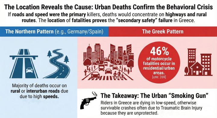 Urban accidents are typically lower speed. In a car-vs-bike collision at 40 km/h, a helmeted rider usually survives with bruises or fractures. An unhelmeted rider often dies from Traumatic Brain Injury (TBI). The high prevalence of urban fatalities in Greece is a “smoking gun” for secondary safety failure. It indicates that riders are dying in survivable, low-speed crashes simply because they are unprotected.